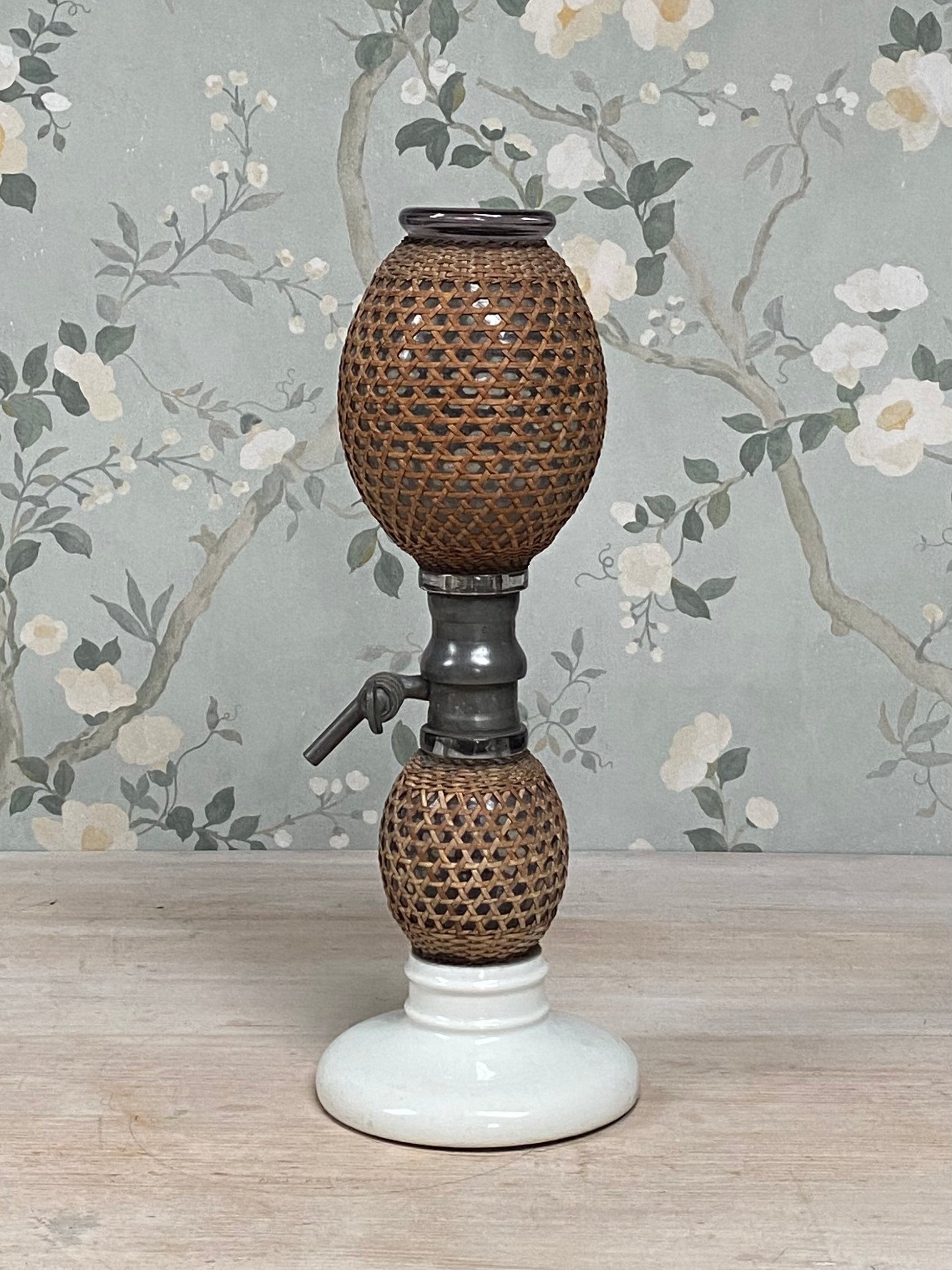 A lovely old French sofa syphon with a white china base, solid glass sections and cane work. All in good condition. This isn't yet wired and could be used as a near pair with one we have already wired. Lamp shade sold separately.